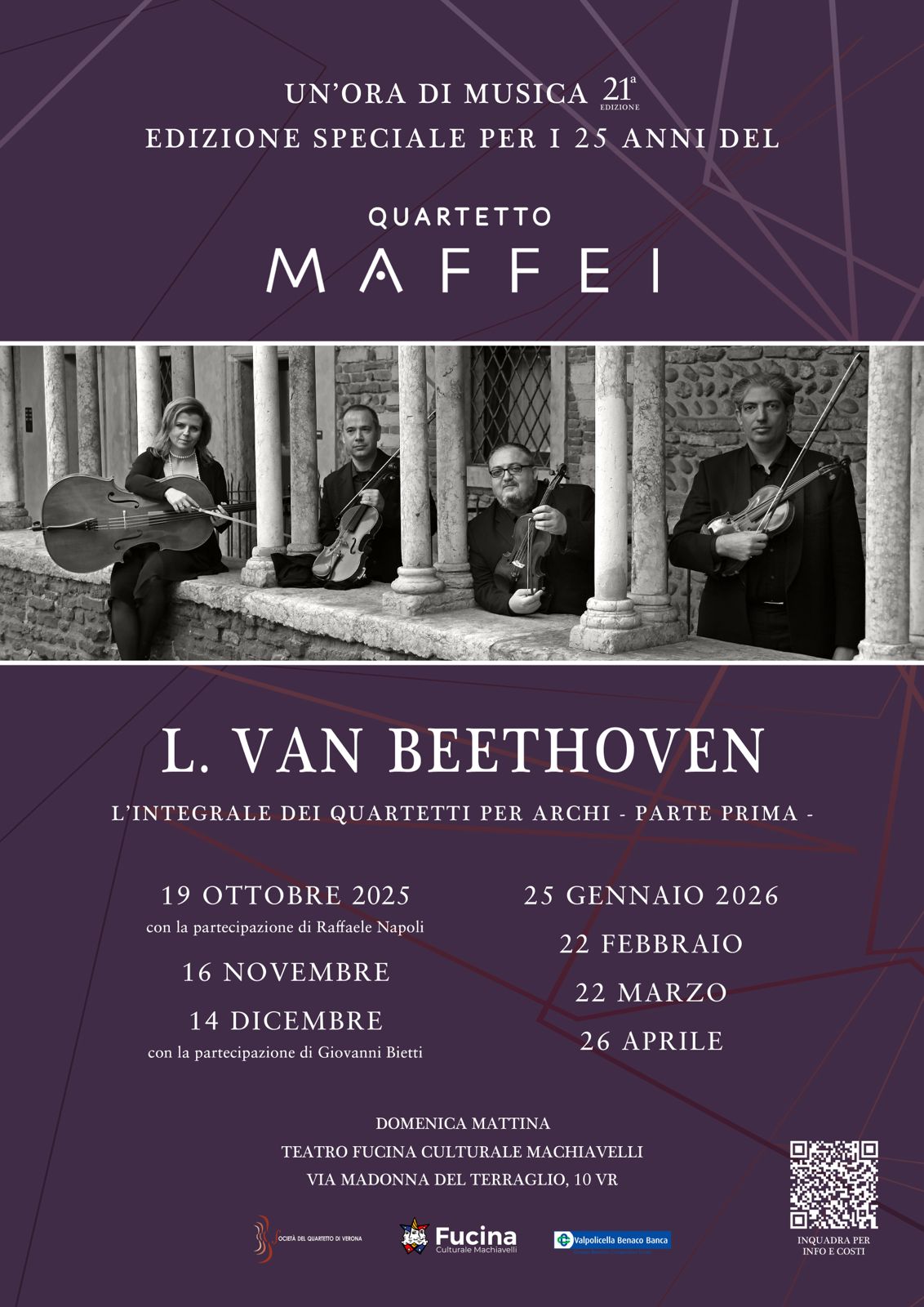 | 19/10/2025 | Verona | Teatro Fucina Machiavelli | Quartetto Maffei | Presentazione con Raffaele Napoli - Quartetto Op. 18 n° 6 |